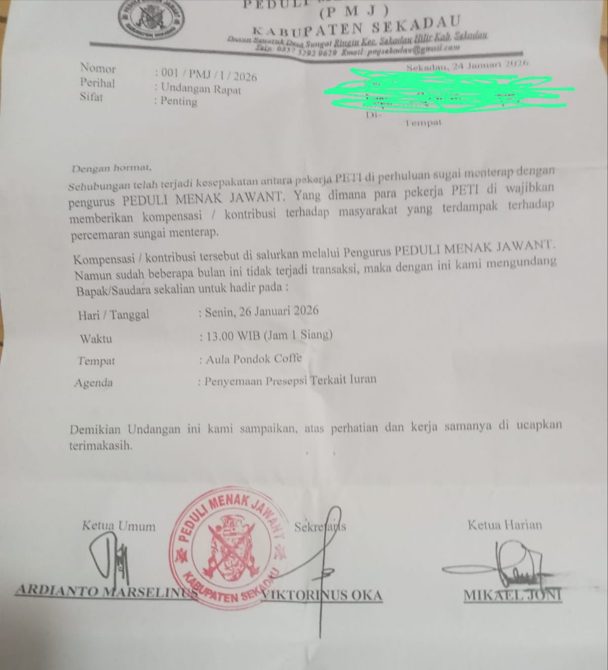Surat undangan rapat Peduli Menak Jawant (PMJ) Kabupaten Sekadau terkait kesepakatan kompensasi pekerja PETI di hulu Sungai Menterap, tertanggal 24 Januari 2026.