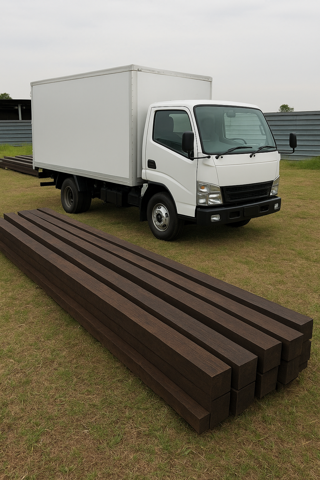 Foto ilustrasi sebuah mobil truck box pengangkat kayu belian serta kayu belian (Ulin)